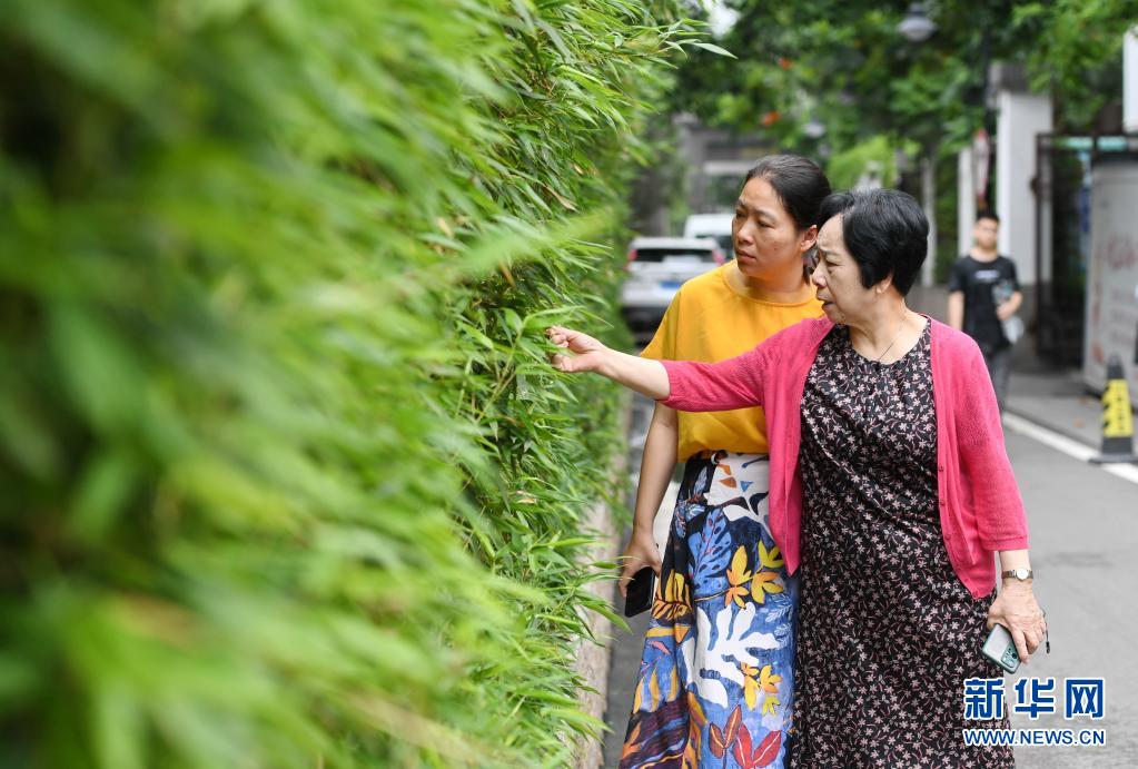 林丹(右)和軍門社區(qū)黨委副書記謝榕在社區(qū)檢查景觀綠植等工作(6月23日攝)。新華社記者 林善傳 攝