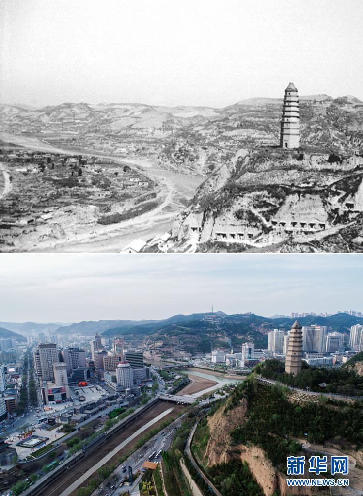 拼版照片:上圖是1938年拍攝的延安(資料照片),下圖是2021年4月22日拍攝的延安市(無(wú)人機(jī)照片,新華社記者張博文攝)。新華社發(fā)