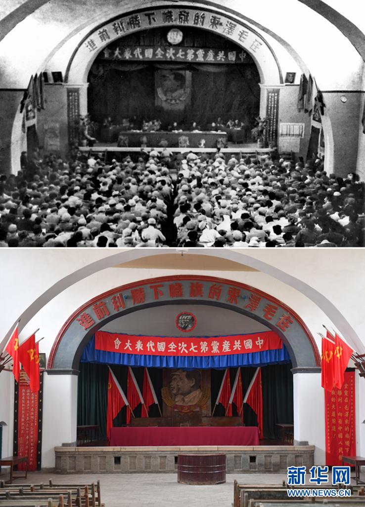 拼版照片:上圖是中共七大會(huì)場(chǎng)(資料照片),下圖是2021年3月31日拍攝的位于延安市楊家?guī)X革命舊址的中共七大會(huì)場(chǎng)(新華社記者 張博文 攝)。新華社發(fā)