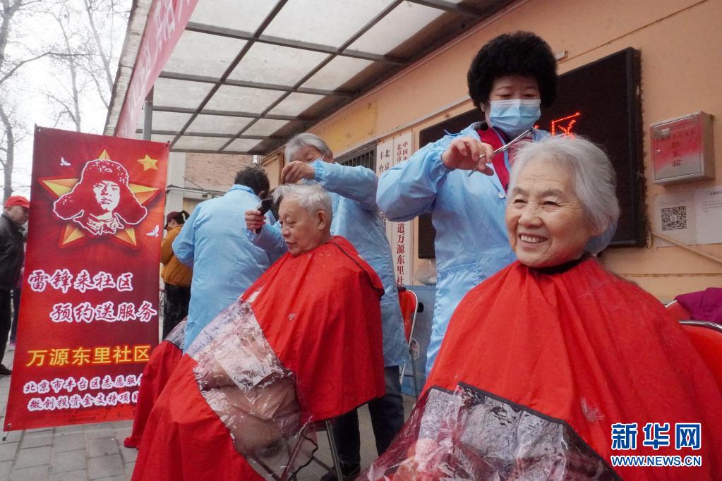 2021年3月5日,北京市豐臺區(qū)東高地街道的志愿者為社區(qū)內(nèi)的老人理發(fā)。新華社記者 李欣 攝