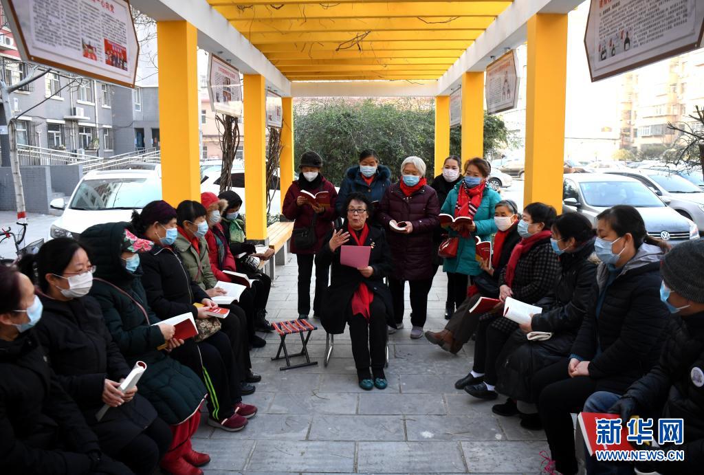 2020年12月22日,河北省石家莊市裕華區(qū)建南社區(qū)年過八十的黨員靳國芳為社區(qū)居民宣講黨的十九屆五中全會精神。新華社記者 王曉 攝