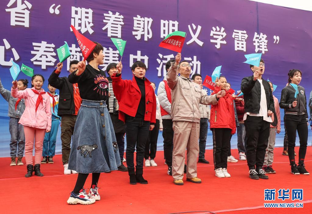 2019年3月5日,在遼寧省葫蘆島市文化廣場舉行的遼寧省“跟著郭明義學(xué)雷鋒”愛心奉獻集中活動現(xiàn)場,郭明義(前排中)與志愿者合唱《學(xué)習(xí)雷鋒好榜樣》歌曲。新華社記者 潘昱龍 攝