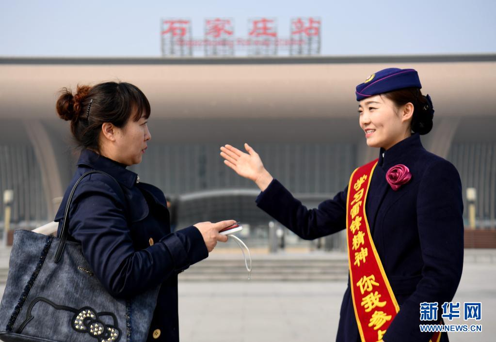 2019年3月5日,在石家莊站廣場,中國鐵路北京局集團有限公司京鐵列服公司石家莊分公司高鐵餐吧部的工作人員引導(dǎo)一名旅客前往候車位置。新華社記者 王曉 攝