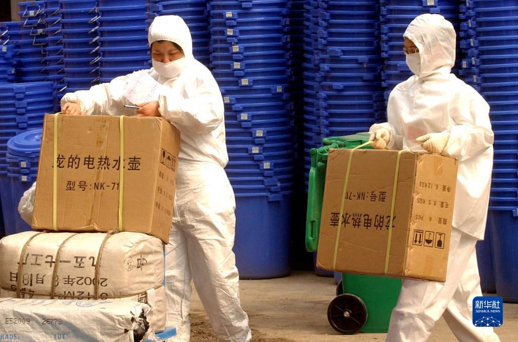 2003年5月7日,北京小湯山“非典”定點(diǎn)醫(yī)院的兩名后勤保障人員在向隔離病區(qū)運(yùn)送物資。新華社記者 王呈選 攝