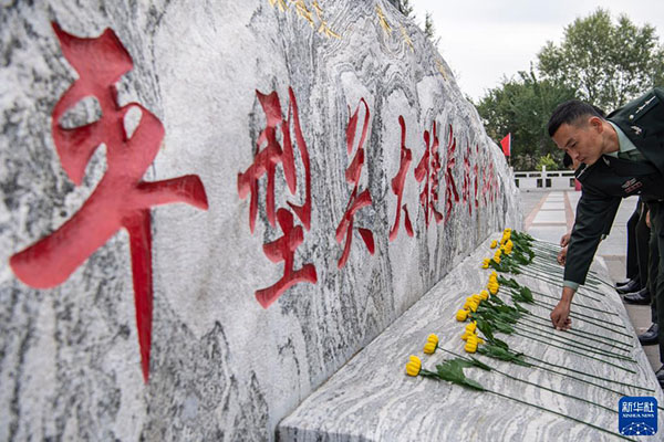 2020年9月25日,在位于山西省大同市靈丘縣的平型關(guān)大捷紀(jì)念館,工作人員向革命先烈獻(xiàn)花。新華社記者 楊晨光 攝
