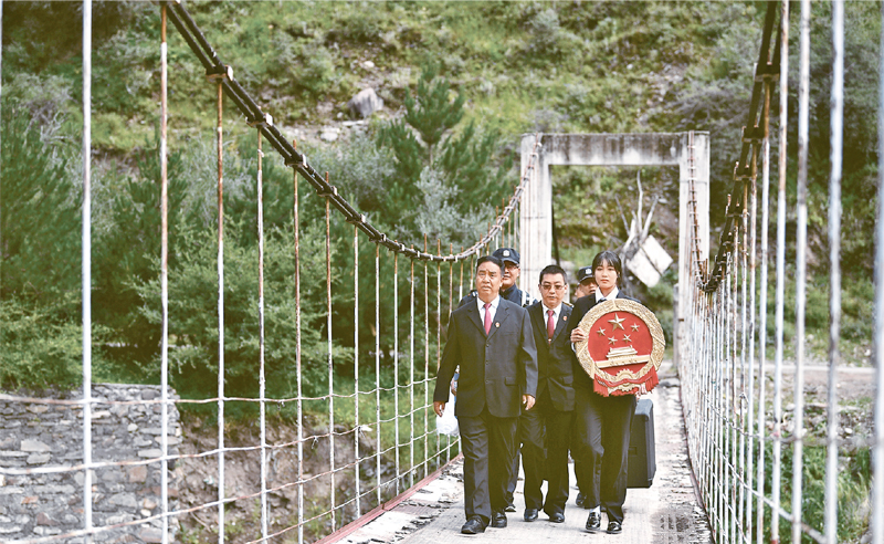 青海省果洛藏族自治州班瑪縣地處高原,山大溝深,群眾居住分散。近年來,班瑪縣人民法院深入各鄉(xiāng)鎮(zhèn),將巡回法庭搬到森林、草原,在牧民家門口提供訴訟服務(wù),還通過以案說法、模擬法庭等形式,開展法律咨詢、法治宣傳。圖為2021年8月7日,班瑪縣人民法院巡回法庭成員前往燈塔鄉(xiāng)班前村提供法律服務(wù)。 新華社記者 張龍/攝