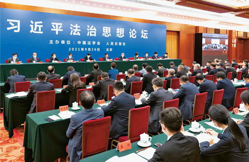 2021年9月26日,由中國法學(xué)會和人民日報社聯(lián)合主辦的習(xí)近平法治思想論壇在京舉行。論壇以“堅定不移走中國特色社會主義法治道路,為全面建成社會主義現(xiàn)代化強國而努力奮斗”為主題,旨在推動社會各界特別是法學(xué)法律界認真學(xué)習(xí)、深入研究、扎實宣傳習(xí)近平法治思想,自覺用習(xí)近平法治思想武裝頭腦、指導(dǎo)實踐、推動工作,譜寫新時代全面依法治國新篇章?! 睹裰髋c法制》社記者 戎珊/攝