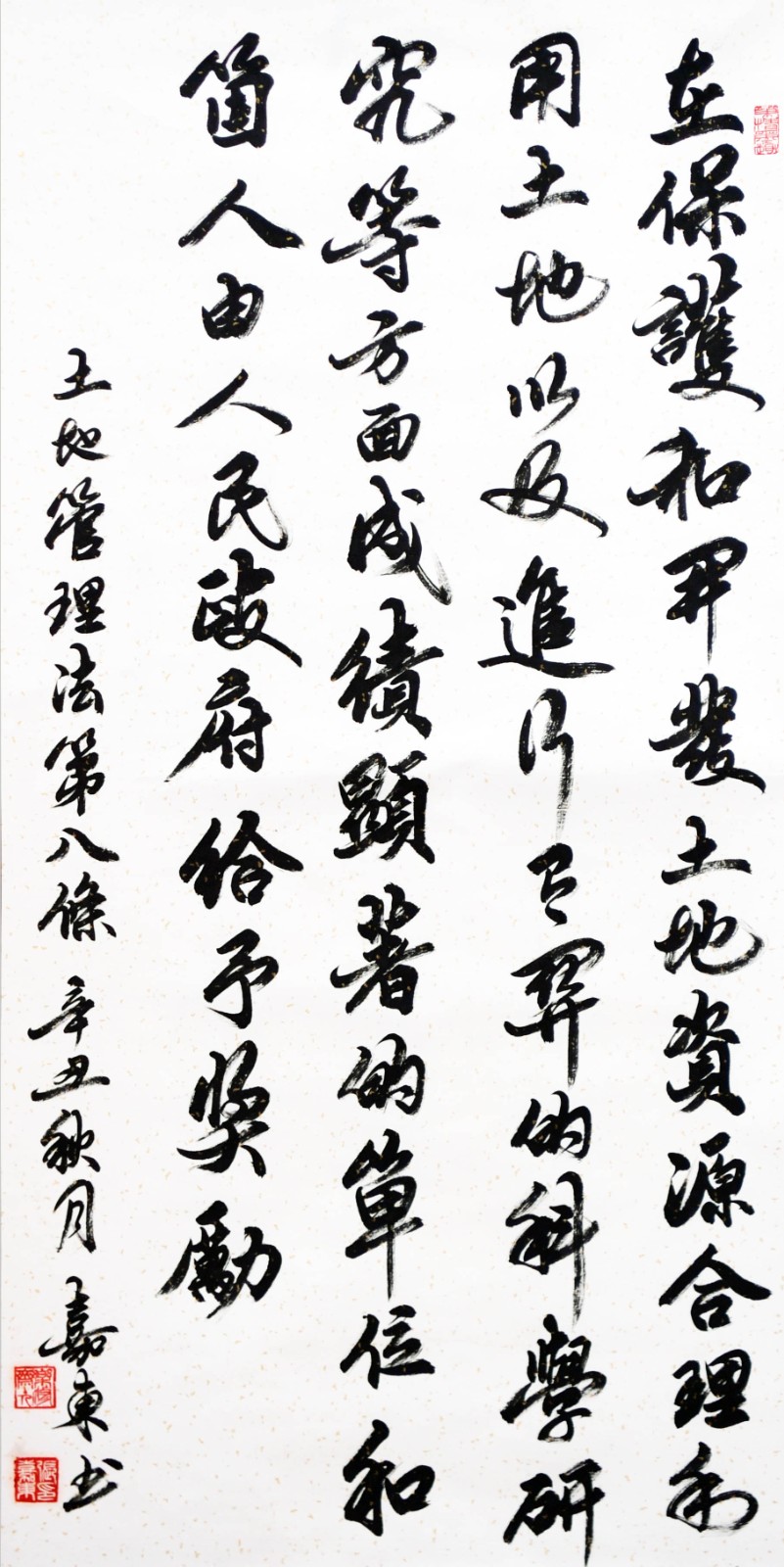 繼1600余位書法家參與書寫《中華人民共和國民法典》全部1260條法條之后,法治日報社聯(lián)合自然資源部法規(guī)司、自然資源部書畫研究會和北京昌平書法家協(xié)會,將筆端對準(zhǔn)土地管理“一法一條例”,即《中華人民共和國土地管理法》和《中華人民共和國土地管理法實施條例》。