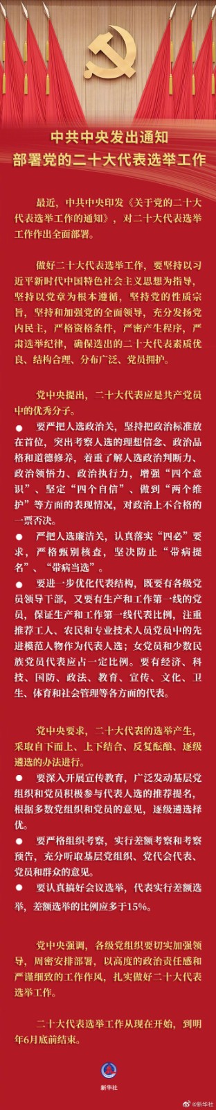 黨中央強調,各級黨組織要切實加強領導,周密安排部署,以高度的政治責任感和嚴謹細致的工作作風,扎實做好二十大代表選舉工作。要嚴肅政治紀律、組織紀律和選舉紀律,充分運用湖南衡陽、四川南充、遼寧等地拉票賄選、破壞選舉案件,開展警示教育,汲取教訓,引以為戒。加強對代表選舉工作的全程監(jiān)督,對違規(guī)違紀違法問題“零容忍”,一經發(fā)現(xiàn)堅決查處,確保風清氣正。要通過做好學習宣傳、組織動員、推薦提名、會議選舉、嚴肅紀律等各項工作,使代表選舉產生過程成為深入學習貫徹習近平新時代中國特色社會主義思想的過程,成為貫徹落實新時代黨的建設總要求和新時代黨的組織路線的過程,成為理想信念教育和黨性黨風黨紀黨史教育的過程,成為黨內政治生活生動實踐和民主集中制教育的過程,進一步增強黨的創(chuàng)造力、凝聚力、戰(zhàn)斗力,動員廣大黨員、干部更加緊密地團結在以習近平同志為核心的黨中央周圍,不忘初心、牢記使命,攻堅克難、開拓奮進,為全面建設社會主義現(xiàn)代化國家、奪取新時代中國特色社會主義偉大勝利、實現(xiàn)中華民族偉大復興的中國夢作出新的更大貢獻。