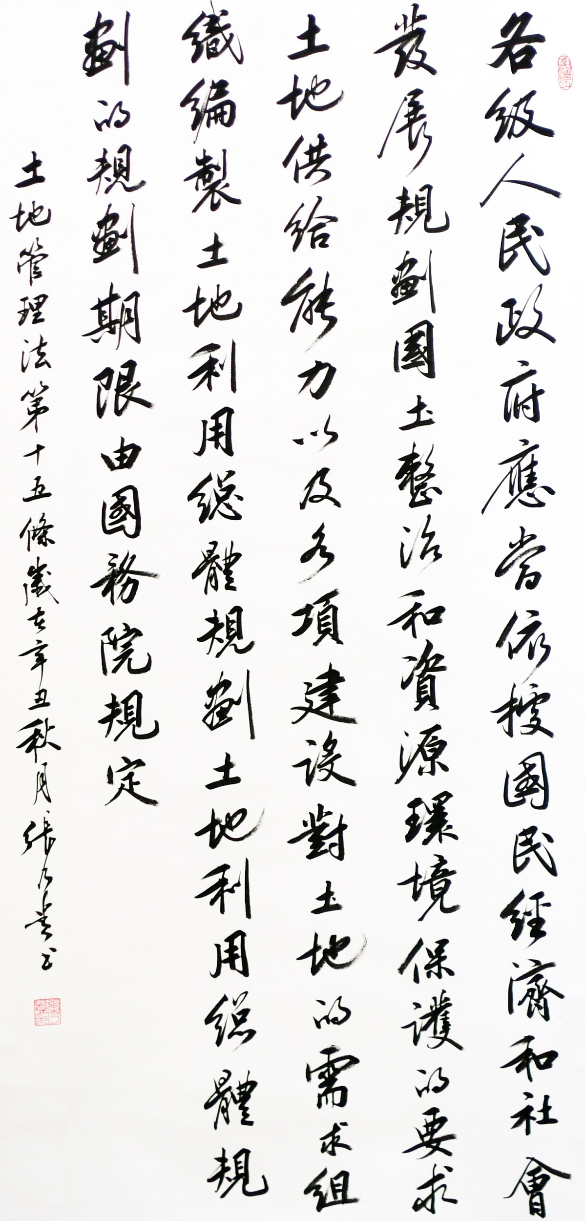 繼1600余位書法家參與書寫《中華人民共和國民法典》全部1260條法條之后,法治日報社聯(lián)合自然資源部法規(guī)司、自然資源部書畫研究會和北京昌平書法家協(xié)會,將筆端對準(zhǔn)土地管理“一法一條例”,即《中華人民共和國土地管理法》和《中華人民共和國土地管理法實施條例》。