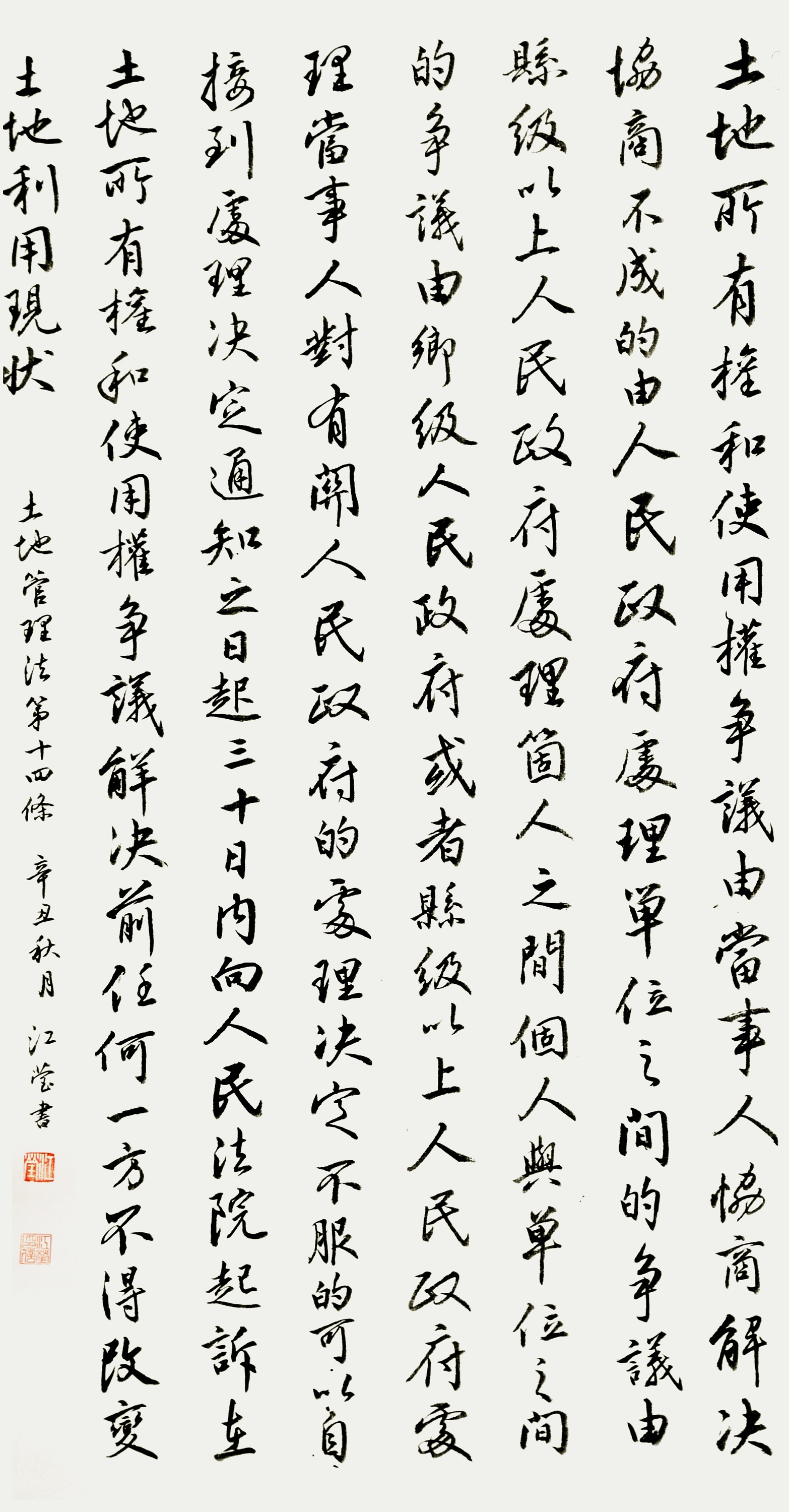 繼1600余位書法家參與書寫《中華人民共和國民法典》全部1260條法條之后,法治日報(bào)社聯(lián)合自然資源部法規(guī)司、自然資源部書畫研究會(huì)和北京昌平書法家協(xié)會(huì),將筆端對準(zhǔn)土地管理“一法一條例”,即《中華人民共和國土地管理法》和《中華人民共和國土地管理法實(shí)施條例》。