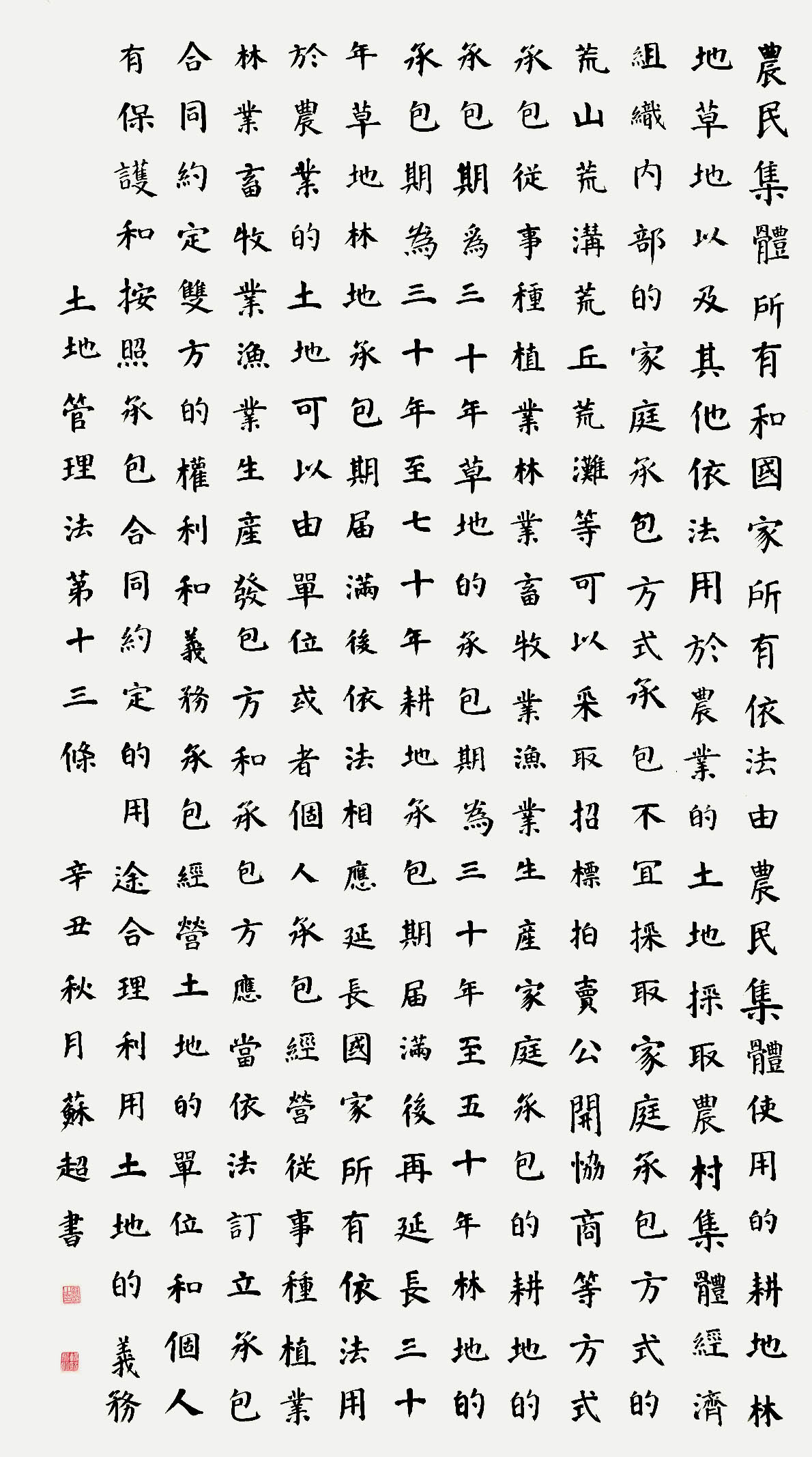 繼1600余位書法家參與書寫《中華人民共和國民法典》全部1260條法條之后,法治日報社聯(lián)合自然資源部法規(guī)司、自然資源部書畫研究會和北京昌平書法家協(xié)會,將筆端對準土地管理“一法一條例”,即《中華人民共和國土地管理法》和《中華人民共和國土地管理法實施條例》。