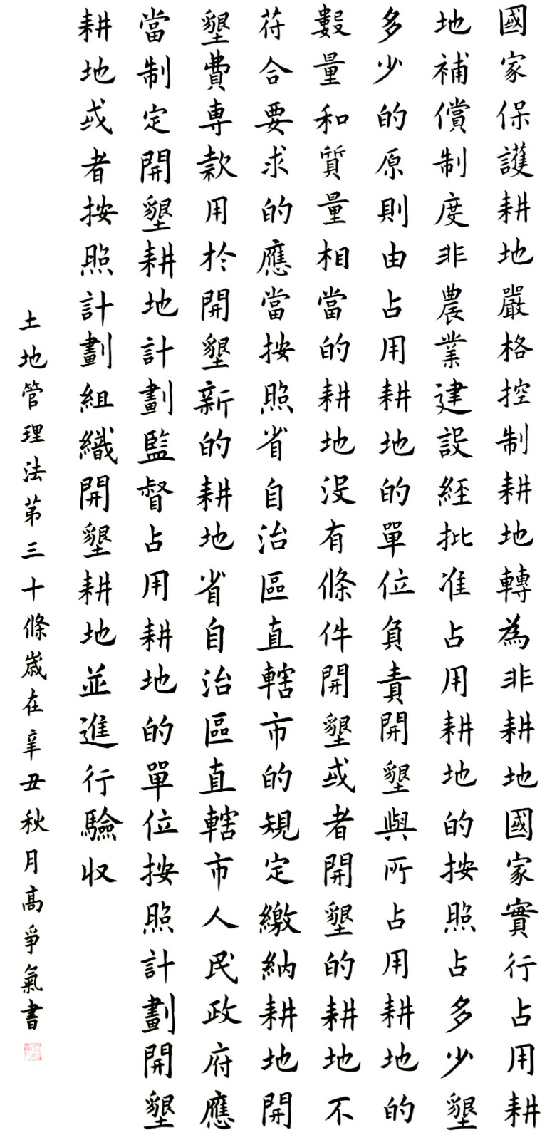 繼1600余位書法家參與書寫《中華人民共和國民法典》全部1260條法條之后,法治日報社聯(lián)合自然資源部法規(guī)司、自然資源部書畫研究會和北京昌平書法家協(xié)會,將筆端對準土地管理“一法一條例”,即《中華人民共和國土地管理法》和《中華人民共和國土地管理法實施條例》。