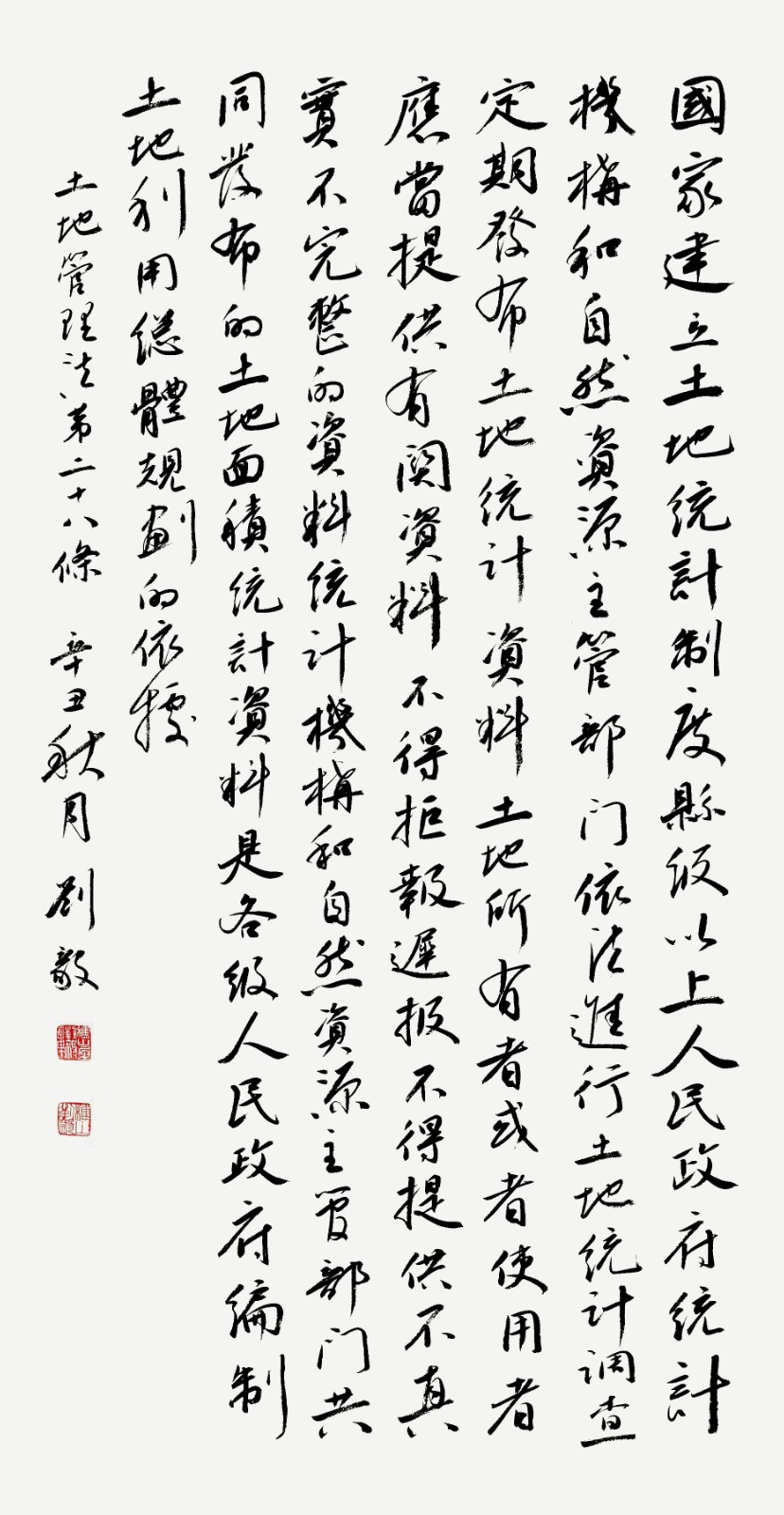 繼1600余位書法家參與書寫《中華人民共和國民法典》全部1260條法條之后,法治日報社聯(lián)合自然資源部法規(guī)司、自然資源部書畫研究會和北京昌平書法家協(xié)會,將筆端對準土地管理“一法一條例”,即《中華人民共和國土地管理法》和《中華人民共和國土地管理法實施條例》。