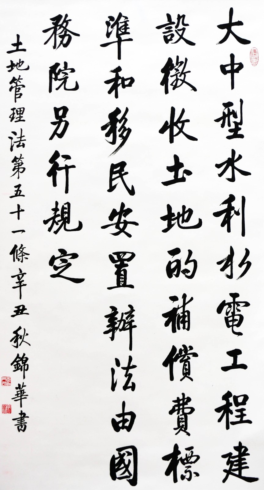 繼1600余位書法家參與書寫《中華人民共和國民法典》全部1260條法條之后,法治日報社聯(lián)合自然資源部法規(guī)司、自然資源部書畫研究會和北京昌平書法家協(xié)會,將筆端對準土地管理“一法一條例”,即《中華人民共和國土地管理法》和《中華人民共和國土地管理法實施條例》。