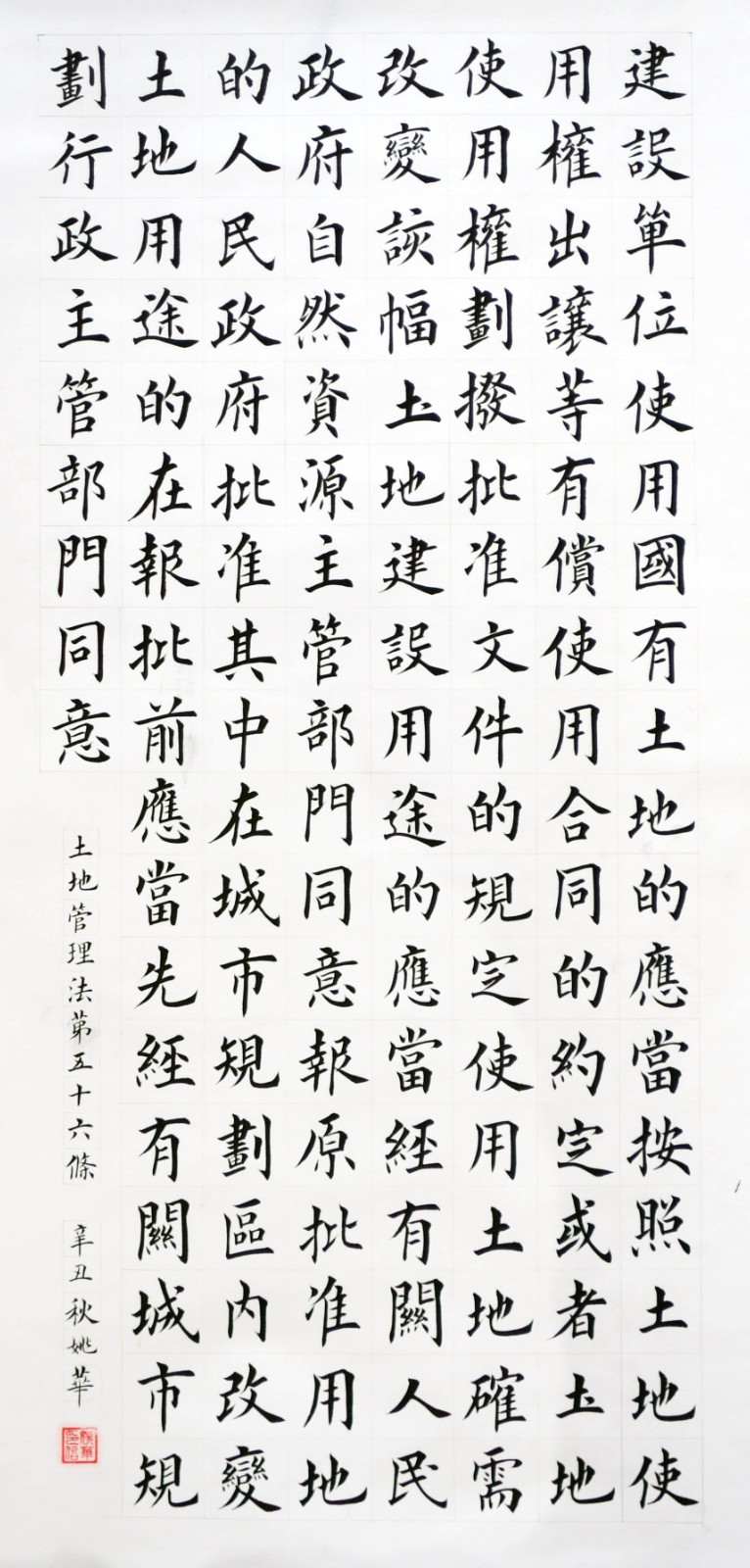 繼1600余位書法家參與書寫《中華人民共和國民法典》全部1260條法條之后,法治日?qǐng)?bào)社聯(lián)合自然資源部法規(guī)司、自然資源部書畫研究會(huì)和北京昌平書法家協(xié)會(huì),將筆端對(duì)準(zhǔn)土地管理“一法一條例”,即《中華人民共和國土地管理法》和《中華人民共和國土地管理法實(shí)施條例》。