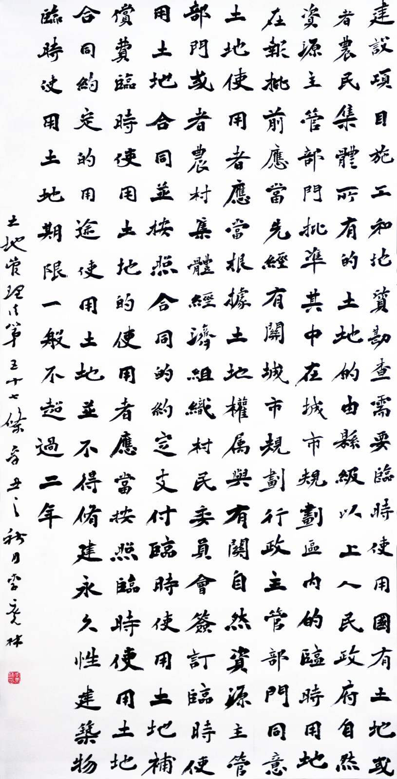 繼1600余位書法家參與書寫《中華人民共和國民法典》全部1260條法條之后,法治日報社聯(lián)合自然資源部法規(guī)司、自然資源部書畫研究會和北京昌平書法家協(xié)會,將筆端對準(zhǔn)土地管理“一法一條例”,即《中華人民共和國土地管理法》和《中華人民共和國土地管理法實施條例》。