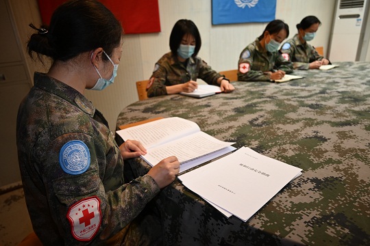維和醫(yī)療分隊官兵學(xué)習(xí)法律法規(guī)和聯(lián)合國規(guī)范性文件。李曉龍 攝