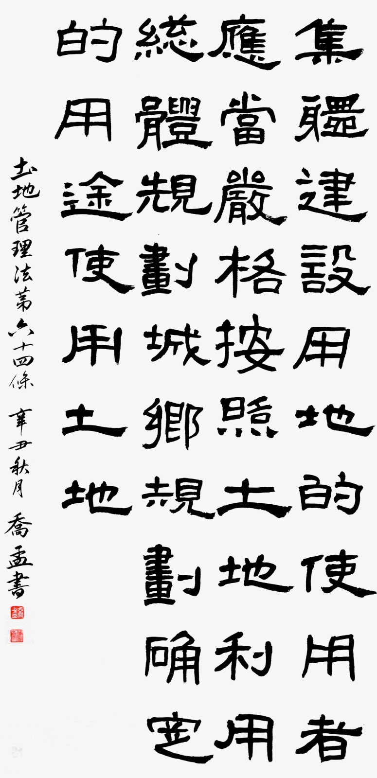 繼1600余位書法家參與書寫《中華人民共和國民法典》全部1260條法條之后,法治日?qǐng)?bào)社聯(lián)合自然資源部法規(guī)司、自然資源部書畫研究會(huì)和北京昌平書法家協(xié)會(huì),將筆端對(duì)準(zhǔn)土地管理“一法一條例”,即《中華人民共和國土地管理法》和《中華人民共和國土地管理法實(shí)施條例》。