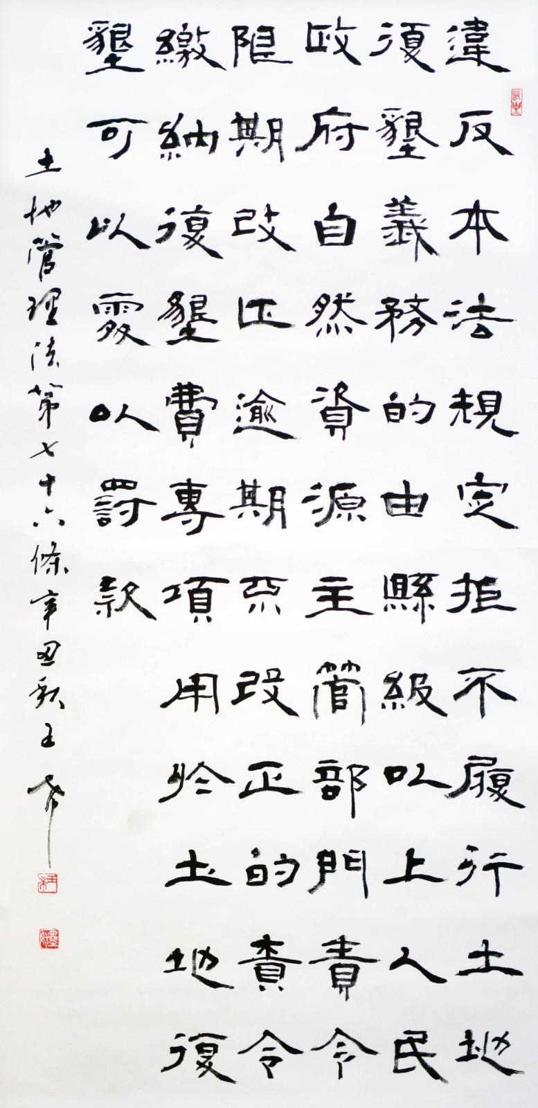 繼1600余位書法家參與書寫《中華人民共和國民法典》全部1260條法條之后,法治日?qǐng)?bào)社聯(lián)合自然資源部法規(guī)司、自然資源部書畫研究會(huì)和北京昌平書法家協(xié)會(huì),將筆端對(duì)準(zhǔn)土地管理“一法一條例”,即《中華人民共和國土地管理法》和《中華人民共和國土地管理法實(shí)施條例》。