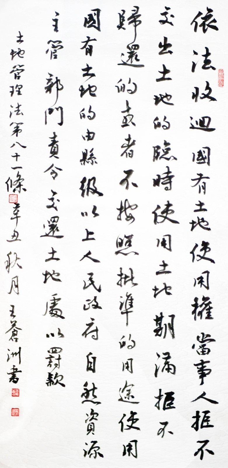 繼1600余位書法家參與書寫《中華人民共和國民法典》全部1260條法條之后,法治日?qǐng)?bào)社聯(lián)合自然資源部法規(guī)司、自然資源部書畫研究會(huì)和北京昌平書法家協(xié)會(huì),將筆端對(duì)準(zhǔn)土地管理“一法一條例”,即《中華人民共和國土地管理法》和《中華人民共和國土地管理法實(shí)施條例》。