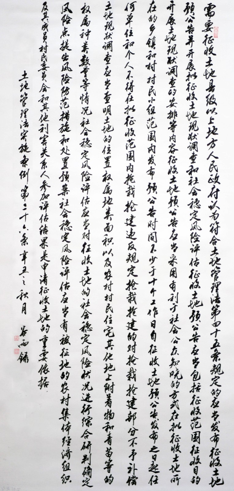 繼1600余位書法家參與書寫《中華人民共和國民法典》全部1260條法條之后,法治日報(bào)社聯(lián)合自然資源部法規(guī)司、自然資源部書畫研究會和北京昌平書法家協(xié)會,將筆端對準(zhǔn)土地管理“一法一條例”,即《中華人民共和國土地管理法》和《中華人民共和國土地管理法實(shí)施條例》。