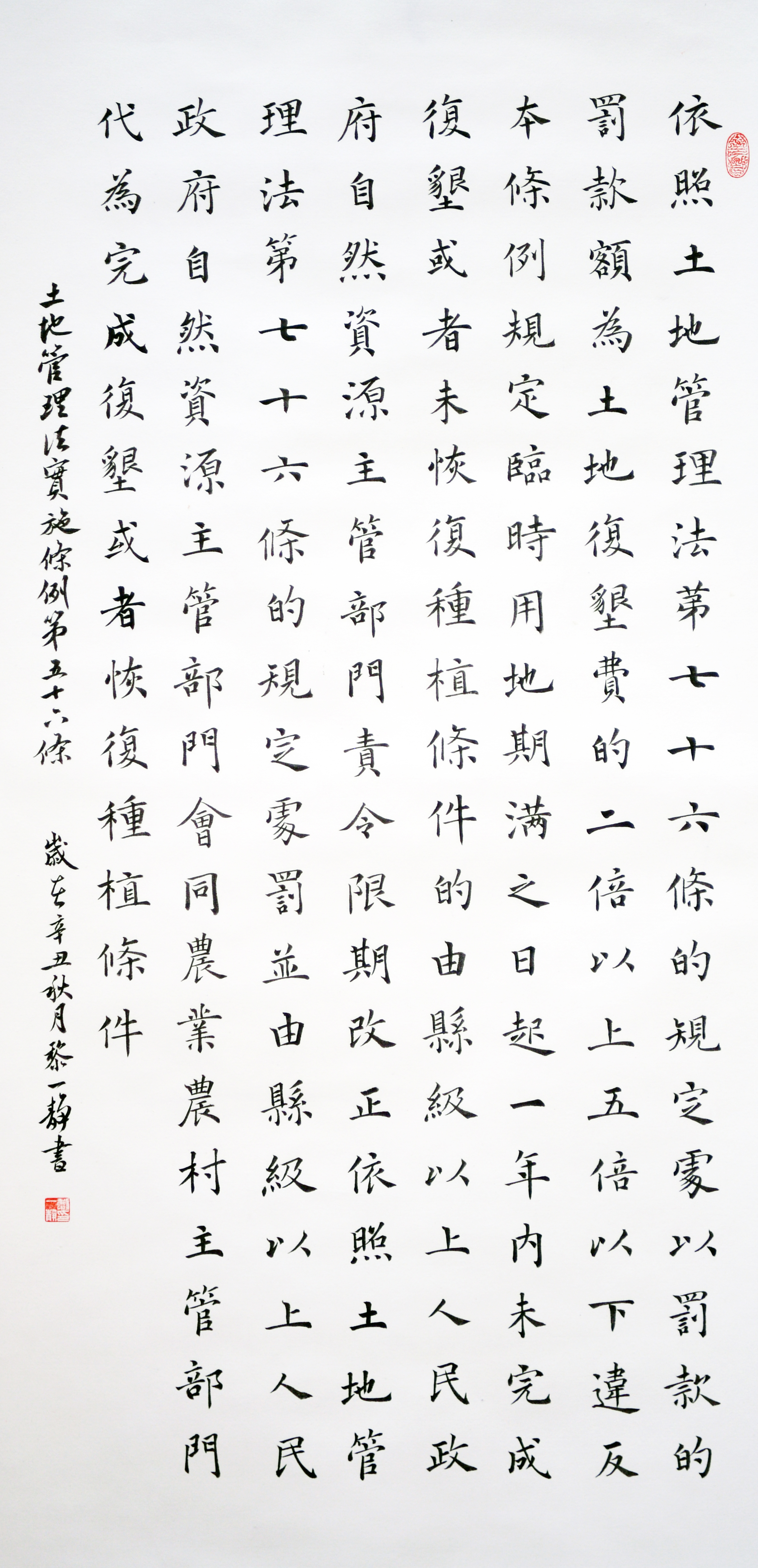 繼1600余位書法家參與書寫《中華人民共和國民法典》全部1260條法條之后,法治日報社聯(lián)合自然資源部法規(guī)司、自然資源部書畫研究會和北京昌平書法家協(xié)會,將筆端對準(zhǔn)土地管理“一法一條例”,即《中華人民共和國土地管理法》和《中華人民共和國土地管理法實施條例》。