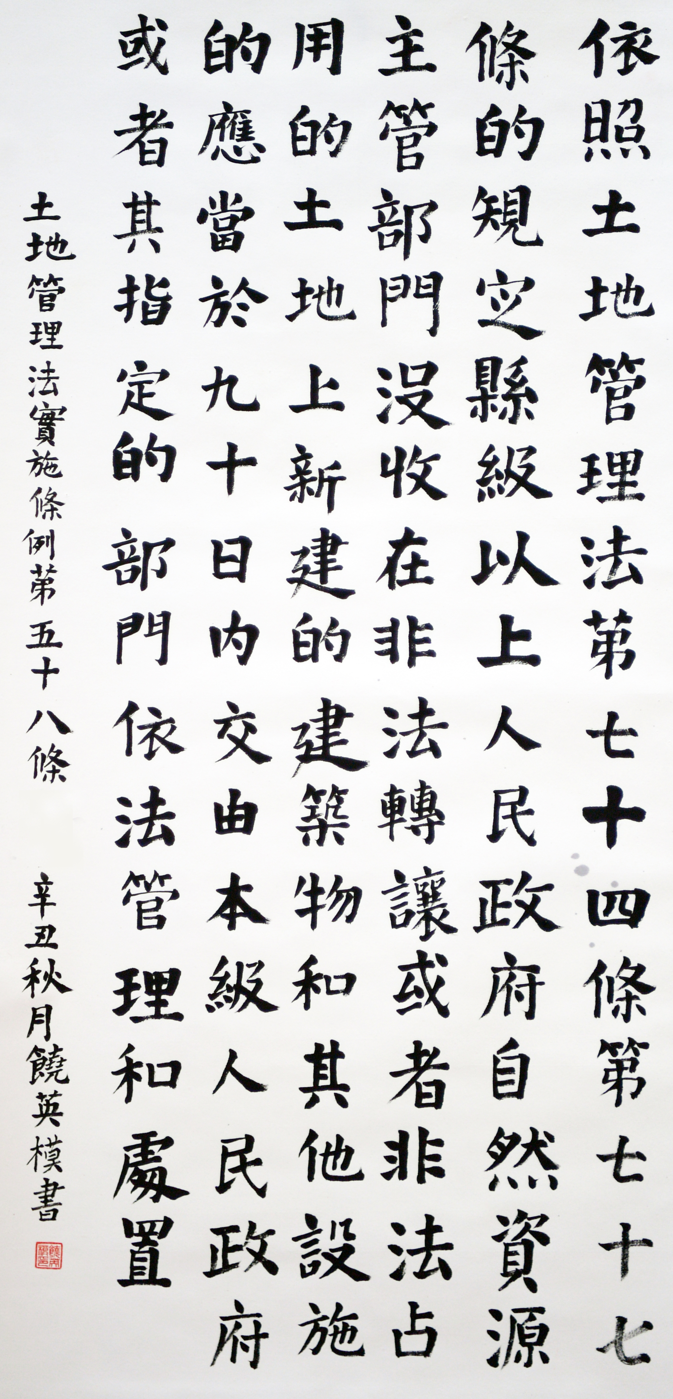 繼1600余位書法家參與書寫《中華人民共和國民法典》全部1260條法條之后,法治日?qǐng)?bào)社聯(lián)合自然資源部法規(guī)司、自然資源部書畫研究會(huì)和北京昌平書法家協(xié)會(huì),將筆端對(duì)準(zhǔn)土地管理“一法一條例”,即《中華人民共和國土地管理法》和《中華人民共和國土地管理法實(shí)施條例》。
