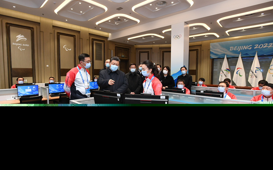 1月4日,中共中央總書記、國家主席、中央軍委主席習(xí)近平在北京考察2022年冬奧會、冬殘奧會籌辦備賽工作。這是4日下午,習(xí)近平在北京冬奧運(yùn)行指揮部調(diào)度中心考察。新華社記者 謝環(huán)馳 攝