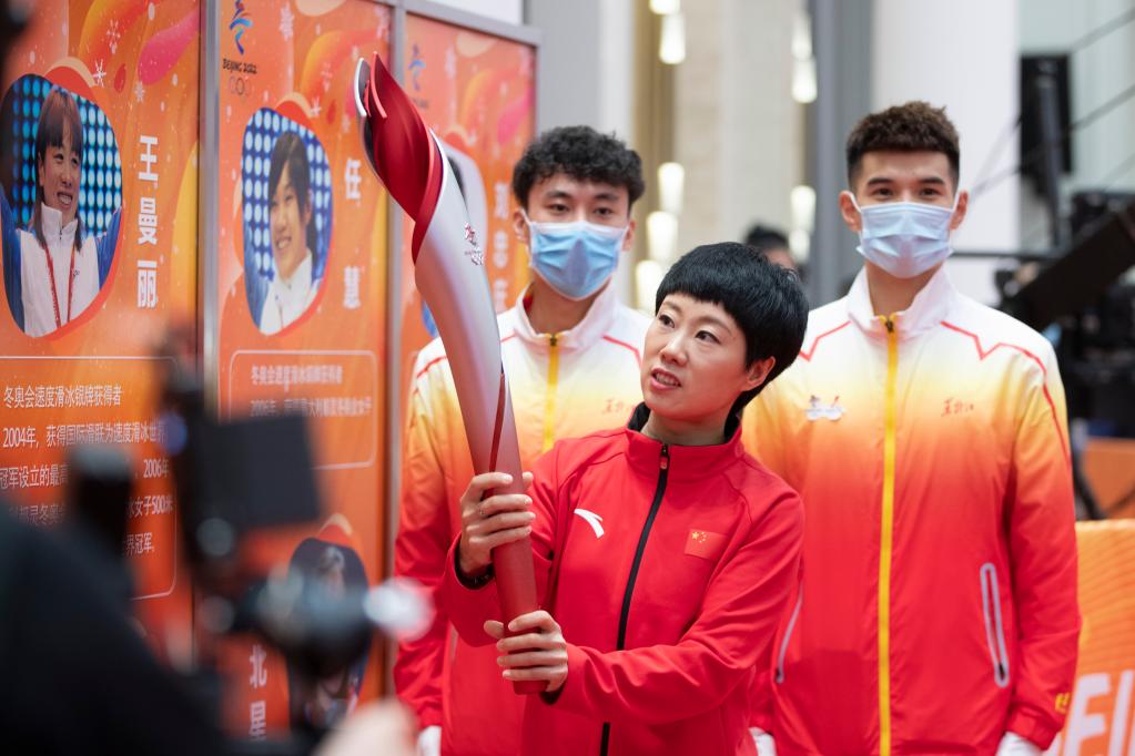 1月5日,冬奧會(huì)短道速滑冠軍張會(huì)(中)在北京2022年冬奧會(huì)火炬展示活動(dòng)現(xiàn)場(chǎng)手持火炬進(jìn)行展示。新華社記者 張濤 攝