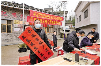 當(dāng)天下午,記者跟隨蘭俊來(lái)到平定營(yíng)社區(qū)高枧坡村民組。在該村葆初廣場(chǎng)的墻面上,寫(xiě)著“永遠(yuǎn)跟黨走”“八要八不要”村規(guī)民約以及一些移風(fēng)易俗的宣傳標(biāo)語(yǔ)。廣場(chǎng)上,愛(ài)好書(shū)法的蘭俊邀請(qǐng)書(shū)法朋友圈人士在這里義務(wù)為村民寫(xiě)春聯(lián),給村民送去新春祝福。