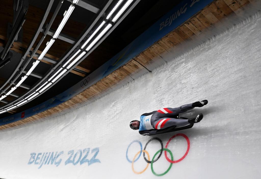 2月5日,奧地利選手沃爾夫?qū)そ鸬聽栐诒本?022年冬奧會男子單人雪橇項目比賽中。新華社記者 賀長山 攝