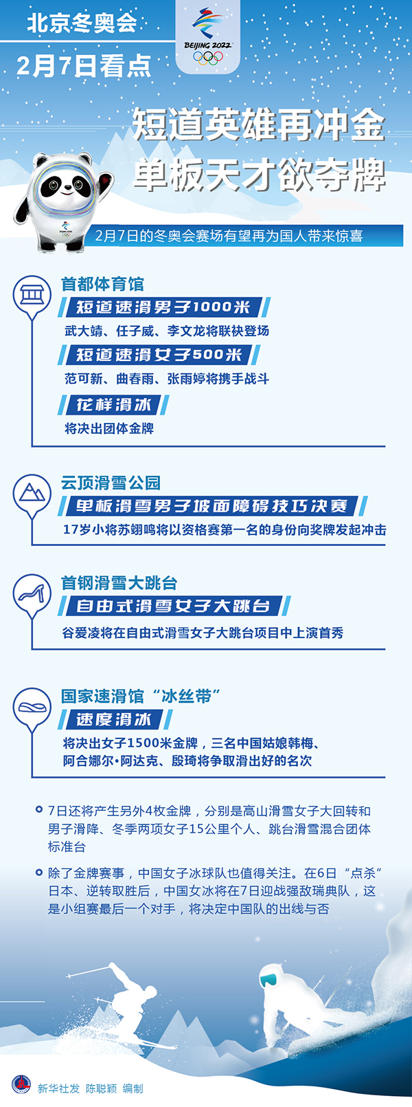 新華社北京2月6日電(記者張澤偉 王恒志)7日的冬奧會(huì)賽場(chǎng)有望再為國(guó)人帶來(lái)驚喜。為中國(guó)代表團(tuán)摘得首金的武大靖、任子威、范可新、曲春雨將再登冰場(chǎng),沖擊短道速滑男子1000米和女子500米金牌。以資格賽頭名晉級(jí)的中國(guó)單板滑雪小將蘇翊鳴,將拿出更難的動(dòng)作沖擊男子坡面障礙技巧獎(jiǎng)牌,書(shū)寫(xiě)中國(guó)雪上項(xiàng)目新的歷史。谷愛(ài)凌則將在自由式滑雪大跳臺(tái)項(xiàng)目中上演冬奧首秀。