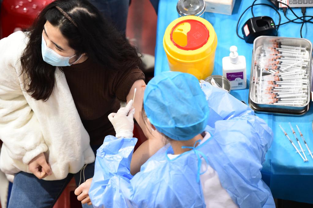 2022年1月6日,在安徽農(nóng)業(yè)大學(xué)新冠疫苗接種點,醫(yī)護人員為師生接種新冠疫苗加強針。(新華社記者黃博涵 攝)