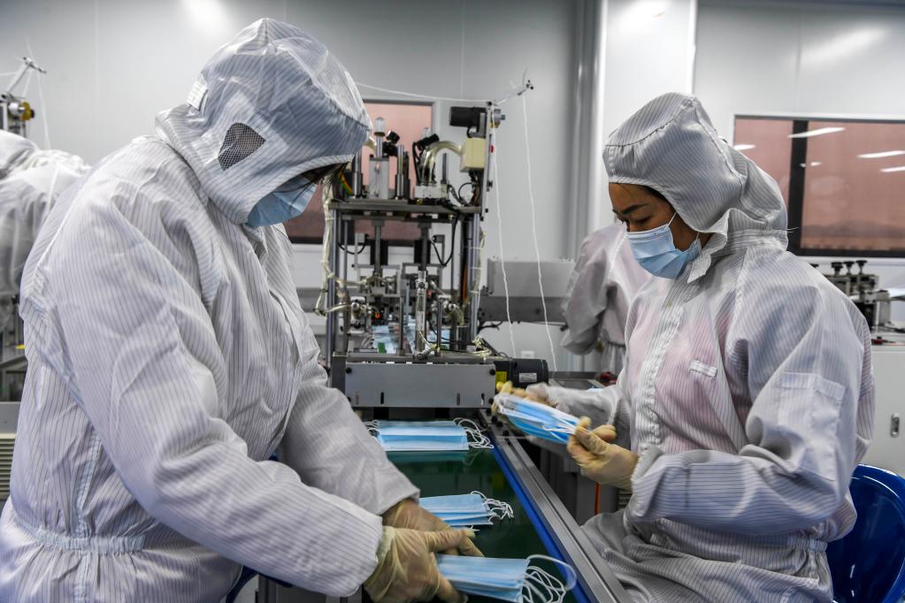 2022年2月18日,在廣西百色市一家口罩生產(chǎn)企業(yè)內(nèi),工作人員在生產(chǎn)線上忙碌。自2月15日零時起,廣西百色市部分縣(市、區(qū))解除“不進不出”管控措施,當(dāng)?shù)卣行驈?fù)工復(fù)產(chǎn)。(新華社記者曹祎銘 攝)