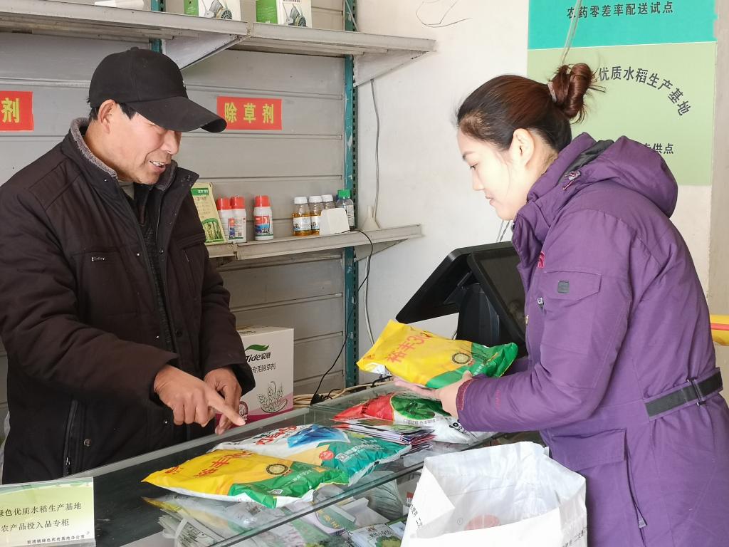 權(quán)太琦(右)在農(nóng)資銷售店詢問價格變化。 新華社記者 陸華東 攝