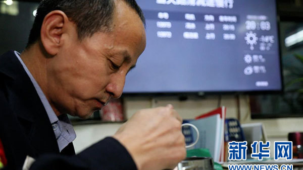 馮冰一邊吃飯,一邊用余光看著調度表上的時間。新華網 吳銀冰 攝