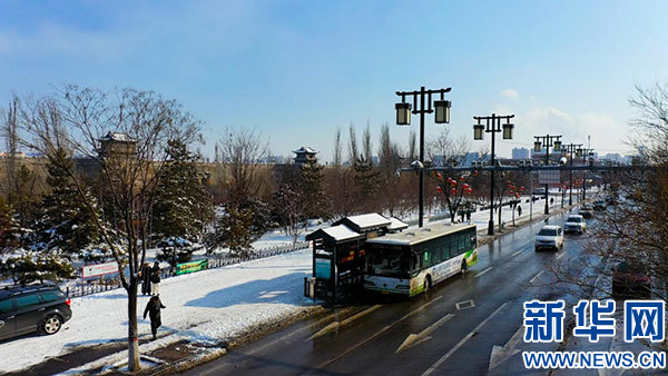 雪天大同公交、大同古城、藍天。新華網 發(fā)(趙文貴 攝)