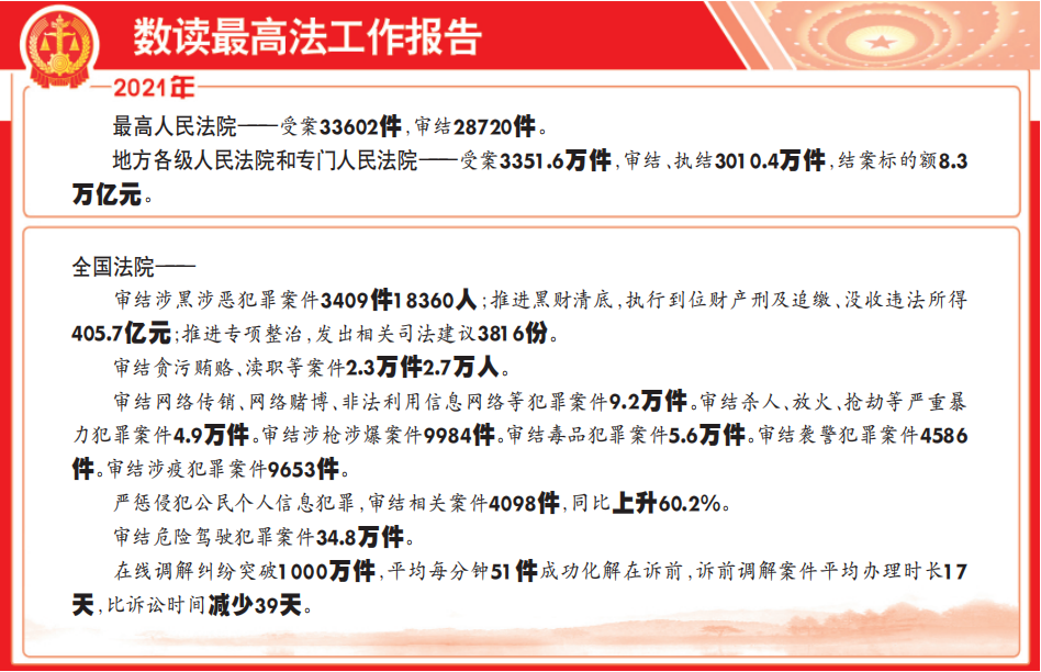 過去一年,司法前行的印記更加清晰,法治中國的腳步更加堅(jiān)毅,報(bào)告中的一個(gè)個(gè)案例,傳遞了鮮明的價(jià)值導(dǎo)向,讓法律條文走進(jìn)千家萬戶。報(bào)告中的一串串?dāng)?shù)據(jù),勾勒出平安中國、法治中國建設(shè)新成效:2021年,最高人民法院受理案件33602件,審結(jié)28720件,制定司法解釋24件,發(fā)布指導(dǎo)性案例31個(gè);地方各級人民法院和專門人民法院受理案件3351.6萬件,審結(jié)、執(zhí)結(jié)3010.4萬件,結(jié)案標(biāo)的額8.3萬億元,助推實(shí)現(xiàn)國家安全、社會(huì)安定、人民安寧。
