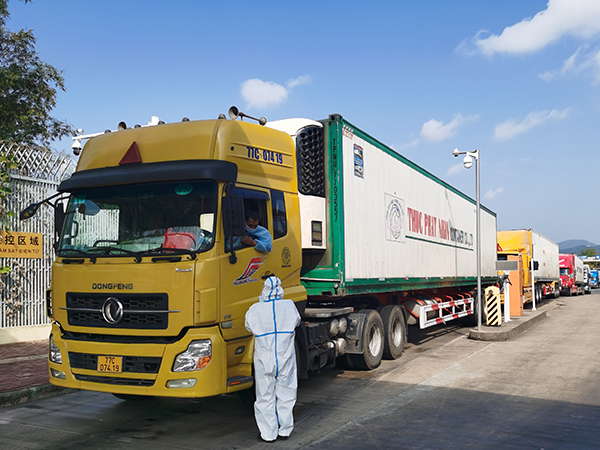 廣西東興出入境邊防檢查站為全力保障口岸貨車及司機(jī)高效、安全、優(yōu)質(zhì)通關(guān),按照閉環(huán)管理要求,全面推行7×24小時(shí)貨物通關(guān)服務(wù),隨到隨檢,全年不休,全力以赴保障疫情防控常態(tài)化條件下中越跨境貿(mào)易順暢通關(guān)。圖為民警對跨境貨車進(jìn)行檢查。林珉正 攝