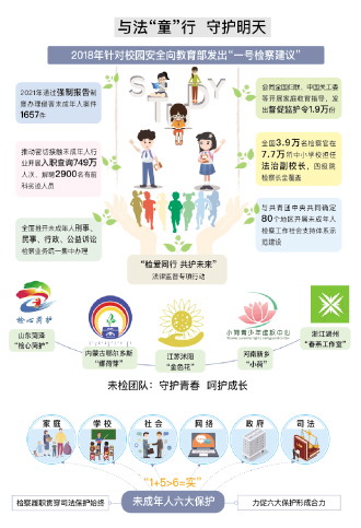 檢察機(jī)關(guān)落實(shí)“法治教育從娃娃抓起”,努力做實(shí)未成年人法治宣傳,擔(dān)任法治副校長的檢察官從2018年的1796人增至2021年的3.9萬人;2021年未檢司法保護(hù)工作立足檢察履職融入家庭保護(hù)、學(xué)校保護(hù)、社會保護(hù)、網(wǎng)絡(luò)保護(hù)、政府保護(hù),實(shí)現(xiàn)“1+5>6=實(shí)”,為孩子們撐起了一片法治的艷陽天。