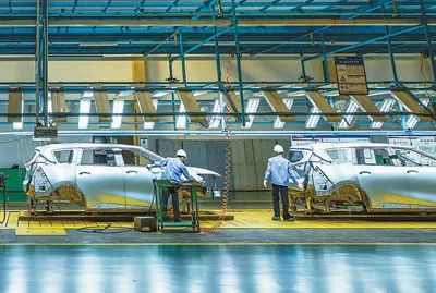 在海南省海馬汽車??诨氐暮秆b車間內(nèi),工人進行流水線作業(yè)。