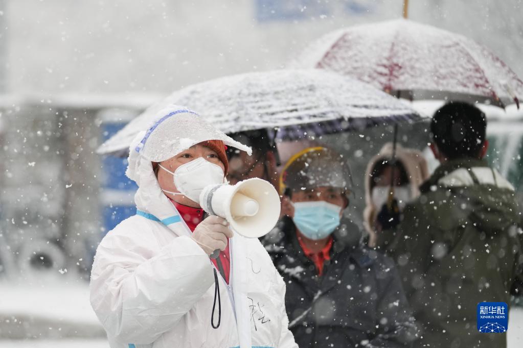 3月18日,在北京市東城區(qū)北新橋街道一處核酸采樣點,工作人員冒雪引導(dǎo)前來檢測的居民。新華社記者 鞠煥宗 攝