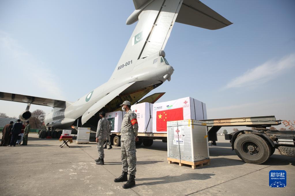這是2021年2月1日在巴基斯坦首都伊斯蘭堡附近的努爾汗空軍基地拍攝的中國政府援助新冠疫苗交接儀式現(xiàn)場。新華社記者 劉天 攝
