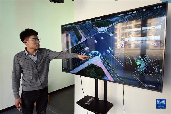 工作人員在雄安數(shù)字交通實(shí)驗(yàn)室介紹數(shù)字交通實(shí)驗(yàn)室項(xiàng)目(1月7日攝)。新華社記者 駱學(xué)峰 攝