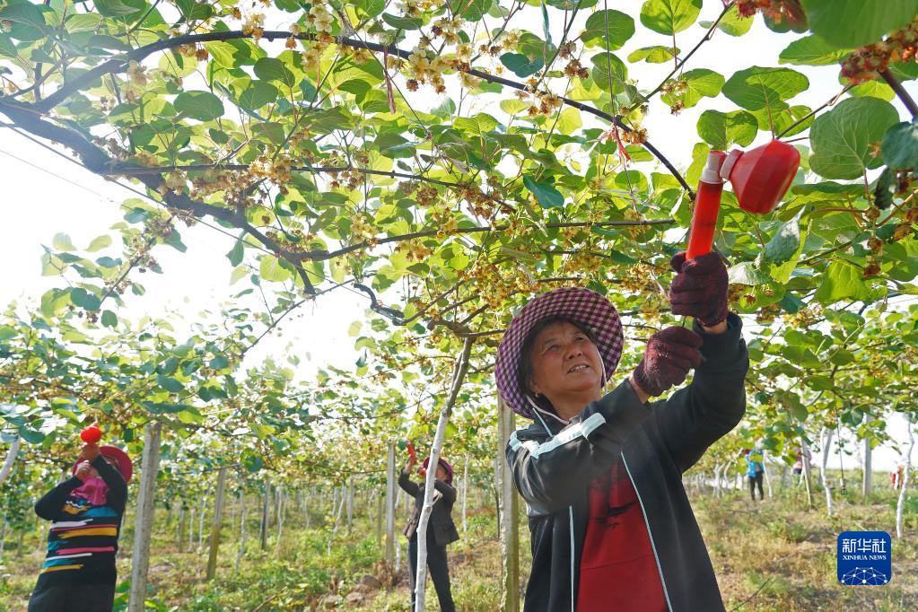 在位于江西宜春市奉新縣赤岸鎮(zhèn)城下村的“初心園”獼猴桃產(chǎn)業(yè)扶貧基地,村民為獼猴桃果樹進行人工授粉(2020年4月29日攝)。新華社記者 萬象 攝