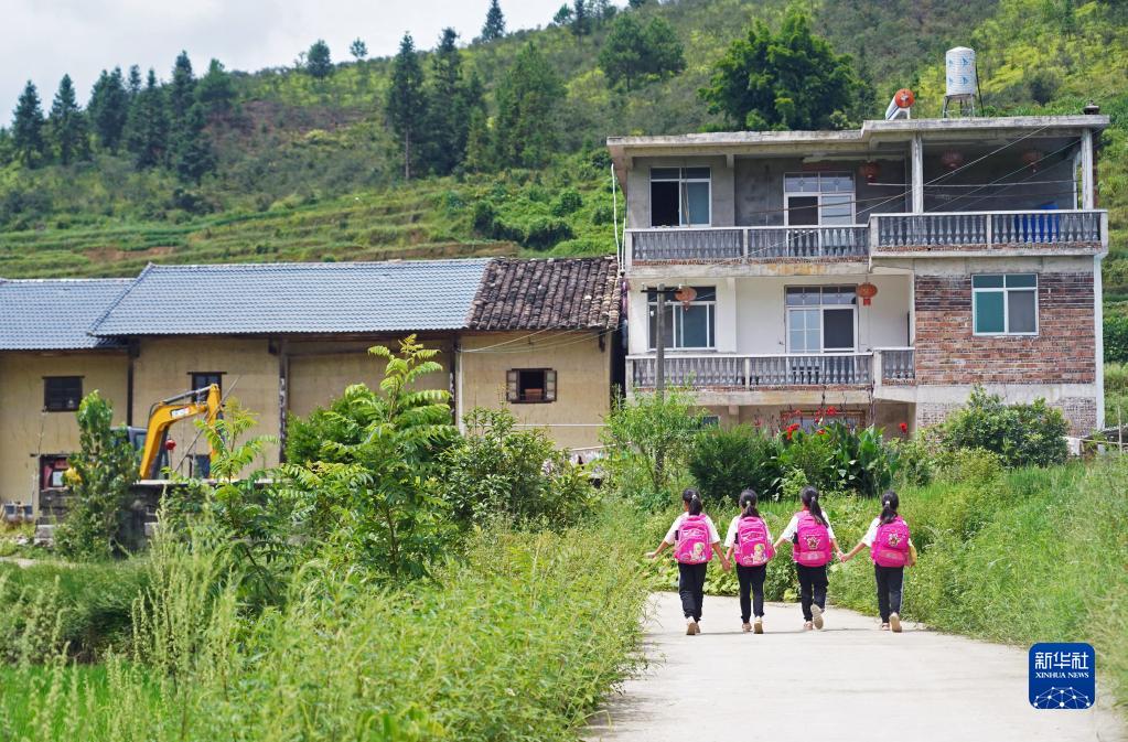在江西省贛州市崇義縣上堡鄉(xiāng)上堡村,孩子們走在放學回家的路上(2020年9月10日攝)。遠處是一戶村民的土坯房祖屋和新建的三層小樓。新華社記者 萬象 攝