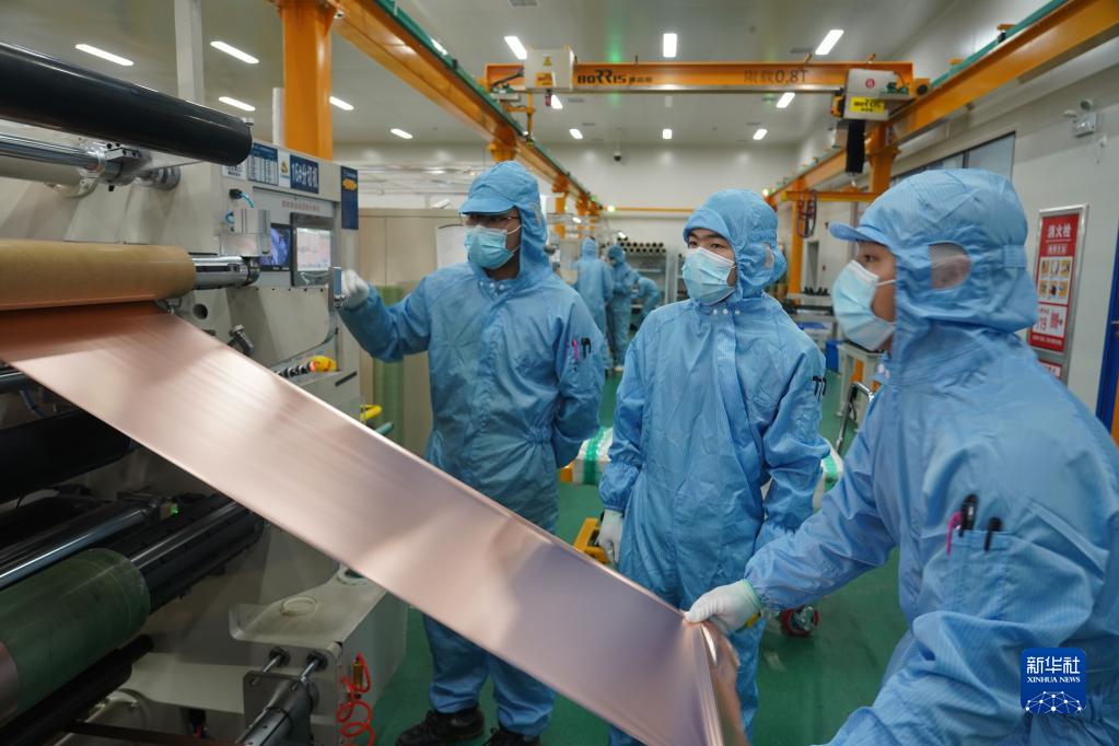 在位于江西南昌高新區(qū)的江銅耶茲銅箔有限公司,工人進行鋰電銅箔分切工序(2022年5月12日攝)。新華社記者 周密 攝