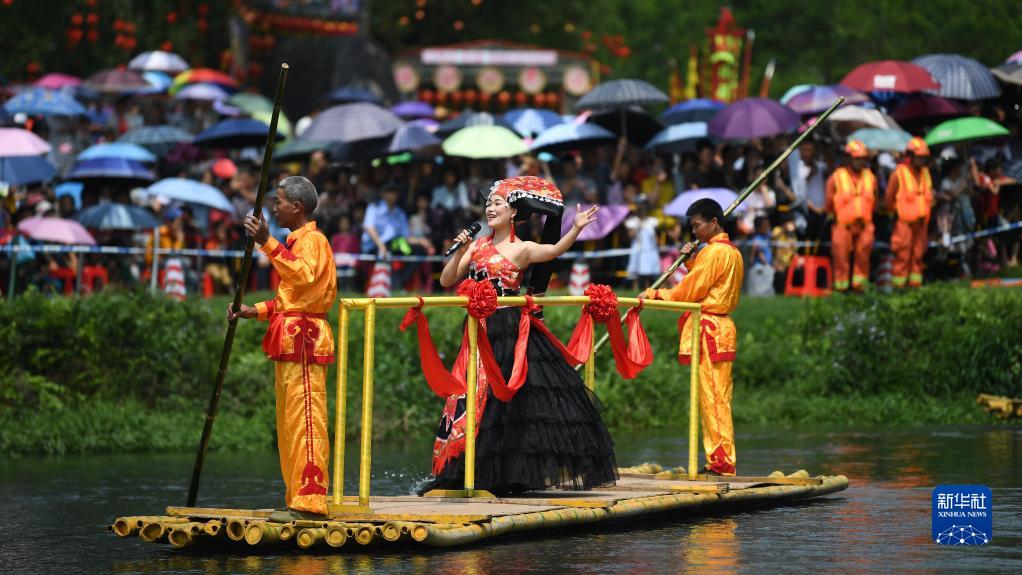 廣西欽州市的一名歌手在歡慶“三月三”活動中演唱壯族傳統(tǒng)民歌(2019年4月7日攝)。新華社記者 張愛林 攝