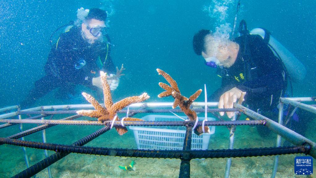 海南省海洋與漁業(yè)科學(xué)研究院的專家和分界洲島旅游區(qū)工作人員在海南省陵水黎族自治縣分界洲島附近海域移植珊瑚(2022年6月7日攝)。新華社記者 張麗蕓 攝